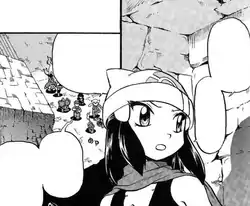 After arriving in the ruins, Ash and Kenny decided to have a battle, but it had to be interrupted when the stairs Dawn was sitting on began to lift, causing Piplup and Aipom to tumble down the steps and Dawn to jump off to save her Pokémon. Seeing that, Ash, Brock, and Kenny rushed to rescue Dawn and everyone ended up inside the ruins, where they encountered several Unown. The Symbol Pokémon living there guarded a gold-colored cube that was stolen by Commander Saturn of Team Galactic.