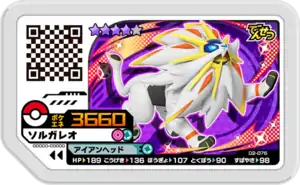 Solgaleo (Japanese: ソルガレオ Solgaleo) is a Grade 4 Pokémon Ga-Olé disk. It is part of the second Dash set.