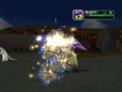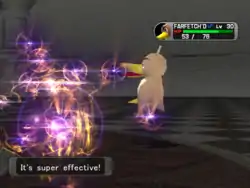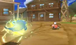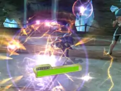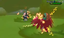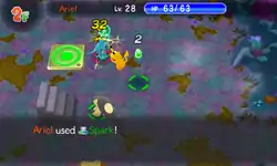 | Plusle's body becomes surrounded in blue electricity and it tackles the opponent, or one of Plusle's hands becomes surrounded by an orb of yellow electricity. Then, the ball fades and Plusle's body glows white or yellow with electricity. Plusle then tackles the opponent. While powered up, Plusle can shoot through the air. | |||