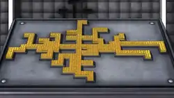 In Journey To The Unown!, Saturn and two Team Galactic Grunts headed inside the Solaceon Ruins. In an inner chamber, they placed the Splash Plate, Draco Plate, and Iron Plate into slots on the floor, which released the Spear Key in the form of a cube.