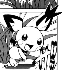 Spiky-eared Pichu first appears in All About Arceus IX, where it is seen accompanying Gold's Pibu as they help Celebi find the herbs needed to cure Giovanni's disease. When several Team Rocket Grunts try to stop Ken, Al, and Harry from helping Celebi under Giovanni's orders, they accidentally trample over the Pichu duo, which causes them to retaliate by shocking the Grunts with a combined Electric attack. When they meet up with Gold, Gold sees Spiky-eared Pichu and teases Pibu about finding a date.
