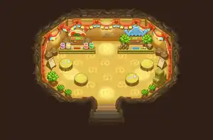 Spinda's Café (Japanese: パッチールのカフェ Patcheel's Café) is a location only in Pokémon Mystery Dungeon: Explorers of Sky. The day after the player and their partner complete Mt. Bristle, they notice there is a Spinda near a rock at the crossroads saying that the location of the rock would be the location of something. The next day, a Wynaut and a Wobbuffet will be there examining the same spot. The day Chatot asks the player to investigate Waterfall Cave, there will be a hole where the rock was and a sign claiming that those who enter will be rewarded with their hopes and dreams. After it finally opens, Wynaut and Wobbuffet will invite the player in. There will be two shops that are available to the player, neither of which cost the player any Poké.