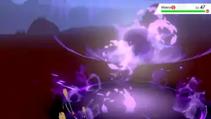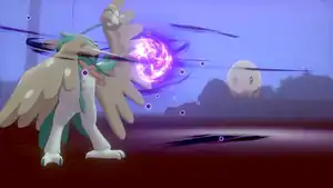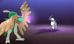 Decidueye draws an arrow quill from its wing, with a shadowy aura surrounding the tip after it's drawn, and fires it at the opponent. The arrow loops around the opponent before striking the ground in front of it, creating a burst of blue fire-like energy around the opponent or sticking the opponent's shadow in place, preventing the opponent from moving. | ||