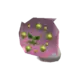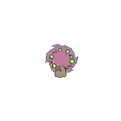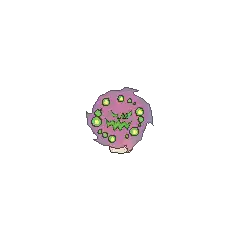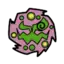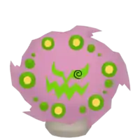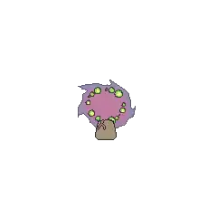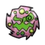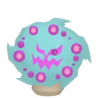 Spiritomb is a ghostly purple Pokémon attached to a stone. Although lacking a physical body, Spiritomb projects its appearance out of a small rock called the Odd Keystone. The rock is trapezoidal in shape and has two small dots. There is a crack running down the middle, splitting in two near the bottom. The crack in combination with the two dots appears to form a frowning face. Spiritomb's projected appearance is an ethereal composition of swirling purple fog. Its face is set in the middle of the fog and contains green, crescent eyes that are connected to its jagged mouth. Its pupils are composed of a spiral and it is sometimes only seen with one. Swirling around its face are green orbs with yellow centers.