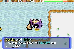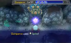 In Red Rescue Team and Blue Rescue Team, and Explorers of Time, Darkness and Sky, Spite is a move with 15PP and 100% accuracy. It targets enemy in the front, reducing the PP of the last move they used to 0. This move is affected by Taunt.