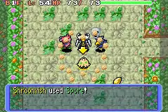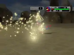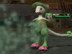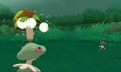 | Shroomish releases a sparkling, pale tan colored powder from the hole on its head at the opponent. | |||