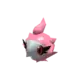 Spritzee is a pink, avian Pokémon. It has a rounded body and a pale blue-gray face. Most of its facial area is taken up by its curved beak, which somewhat resembles a plague doctor's mask. It has large red-orange eyes with long black lashes. On top of its head is a curly tuft of feathers or fur. It has small wings and purple feet with no visible digits.
