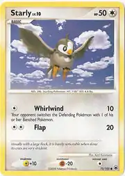 Whirlwind is a move in the Pokémon games that Starly can learn. Flap is a Skill later introduced in Pokémon Shuffle. This card's Pokédex entry comes from Pokémon Pearl.