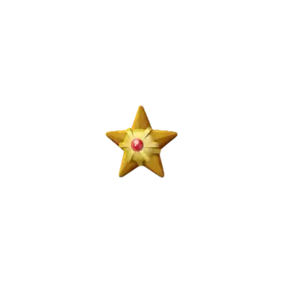 Staryu is a golden-brown, starfish-like Pokémon with five appendages. These appendages surround an exterior organ called the core. The core resembles a golden metal casing with a red gem in the center, which is held in place by a golden ring looped around Staryu's lower left point. If any of Staryu's appendages are lost or eaten by predators like Lumineon, it is unharmed and can grow them back with ease provided the core is still intact.