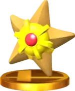 When released from a Poké Ball, Staryu will target one of the opponents, spin towards them, and shoot Swift. Its attack is rapid-fire, but it can easily be escaped from by Directional Influence; the player can still move around while getting hit by Swift. In Ultimate, it appears as a Spirit.