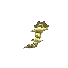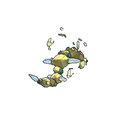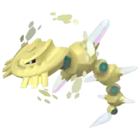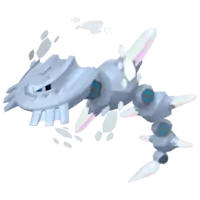 As Mega Steelix, its body becomes longer, almost doubles its mass, and gains more features. Mega Steelix's eyes turn blue and its lower jaw becomes more heavily armored with a round, curved shape. Additionally, a third pair of ridges appear on its bottom jaw, as well as two sharp, flat structures consisting of three conjoined projections on each side. The gray, rock-like spikes and its tail point have transformed into prism-like crystalline spikes; the segments from which the spikes protrude are much larger as well. In-between the head and individual spiked segments are smaller units, now adorned by a black spot with a blue hexagon on each side. Several metallic-looking scraps constantly rotate around its neck; these scraps react to Mega Steelix's movements and change position when attacking. The cells within its body, crystallized by the energy produced from Mega Evolution, are stronger than any mineral and able to withstand any temperature. It moves incredibly slowly, but its strengthened body is also impervious to damage, and it lashes out at foes without flinching. [1]