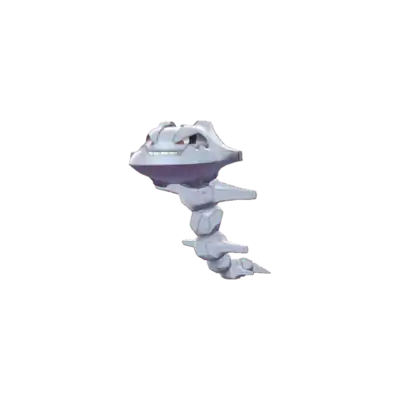Steelix is a long, serpentine Pokémon with a silvery-gray body made up of rock-like sections, which can possess chips and scrapes from fights and tunneling. Three of those sections have long rock spikes coming out of them on either side. It has a massive head mainly made up of its large, wide jaw with sets of large square teeth inside. Along its bottom jaw are ridges: there are two pairs of ridges on a male Steelix, while there is only one pair on a female. Several small, square lumps cover the underside of its lower jaw. Its eye sockets are slightly deep-set, and the eyes themselves are red. Its head has two long ridges going from the eyes up to the top of its head. The tip of its tail is conical with a blunt tip.