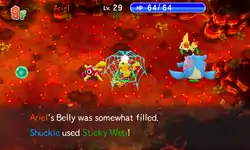 Unlike the other entry hazards present from the core series games, Sticky Web does not produce a trap on the dungeon floor. It instead targets the enemy in front and reduces their Travel Speed. It also makes the enemy's held item sticky. If a teammate is hit by this move, a random item in the Bag or Toolbox becomes sticky.