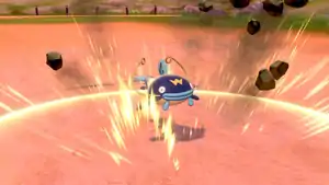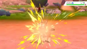 Hangry Mode Morpeko stomps the ground repeatedly before jumping up and hitting the ground with both of its feet at once, sending splinters of the ground flying at the opponent or shaking the ground around it. | ||