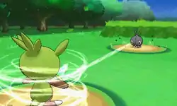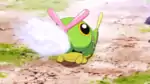 | Sewaddle releases a stream of white sticky string from its mouth at the opponent. It can also shoot string from the back of its head to hang from trees. | |||