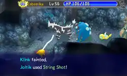 Vikavolt shoots a stream of white thread from its mouth at the opponent, preventing it from moving by tying it up. | ||