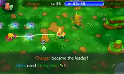 In Red Rescue Team and Blue Rescue Team, and Explorers of Time, Darkness and Sky, String Shot is a move with 16PP and 75% accuracy. The attack travels up to 10 tiles away, and hits the first Pokémon it encounters, ally or enemy, lowering its Movement Speed by one level. This move is affected by Magic Coat and Taunt.