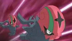 Accelgor's body flashes white, and a double that looks exactly like Accelgor dashes out of its body and at the opponent. When the afterimage is hit by an attack, it disappears in a puff of smoke. | ||