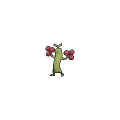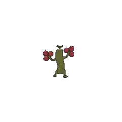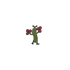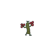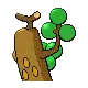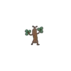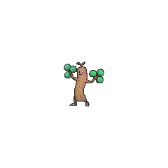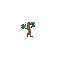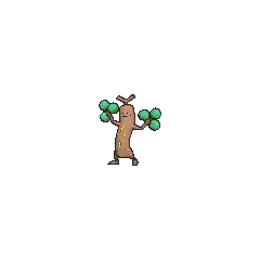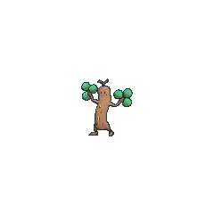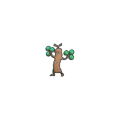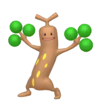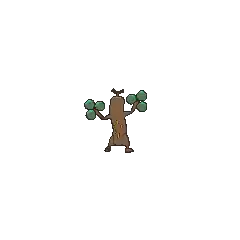 Sudowoodo disguises itself as a tree and stands along paths to avoid being attacked. Its camouflage fails in the winter, as its forelegs remain green, unlike real trees. Sudowoodo is very weak to water and hates it, so whenever it starts to rain, it will break their disguise and flee to the nearest source of shelter. Because it holds its position for so long, its arms have become supple yet strong. It is popular with the elderly, with available magazines and fans devoted to its arm angle and length. Sudowoodo can be found living in forests.