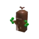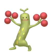 Sudowoodo is a Pokémon that has a brown, log-shaped body with yellow spots. It has short legs with toeless feet, and thin forelegs with three green spheres at the ends of its fingers. It has a forked "branch" on top of its head, which is shorter on the female than on the male. Despite its appearance, Sudowoodo's composition is closer to a rock than a plant.