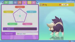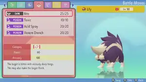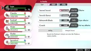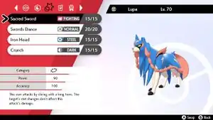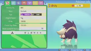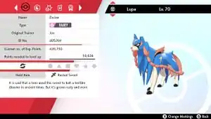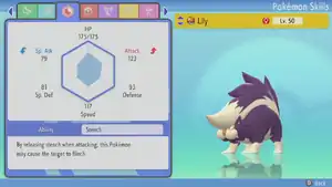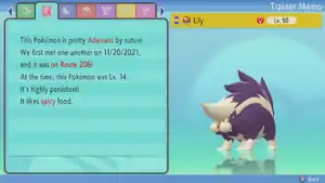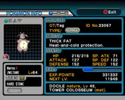 | Nature, Ability, markings, Poké Ball, meeting area, meeting level; move's type, power, accuracy, and description |
