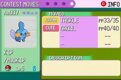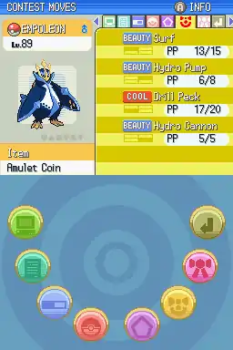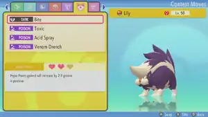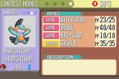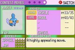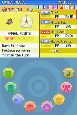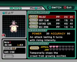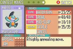 In the Hoenn and Sinnoh-based games, there are two separate move screens: one displays battle properties of moves as usual, and the other displays their properties when used during Contests or Super Contests, which includes the moves' condition and appeal. Only in the Hoenn-based games, the move's jamming is shown in the summary as well.
