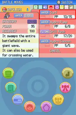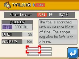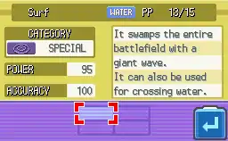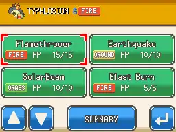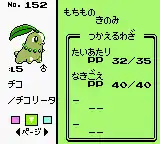 In Generation II only, there is also a "move" (Japanese: つかえるわざ usable techniques) option accessible from the party, which is larger and more detailed than the list of moves found in the stats screen. The move option displays the moves' type, power, and text description as well (but not their accuracy, unlike later games). The "move" option is unavailable during Pokémon battles (even though the summary screen can still be used in battles).