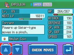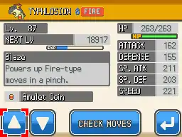 The summary is divided into multiple screens, for different kinds of information. In Generation I only, the game will always display both stats screens of a Pokémon (in order) before returning to the party screen, and it is not possible to switch directly between the stats screens of different Pokémon. Starting from the Generation II games, it is possible to press up and down to check the previous and next Pokémon, as well as press left or right to choose between different summary screens.
