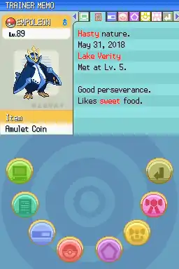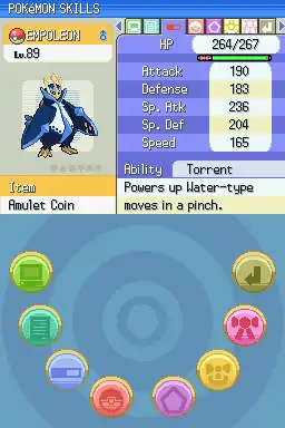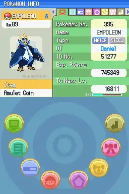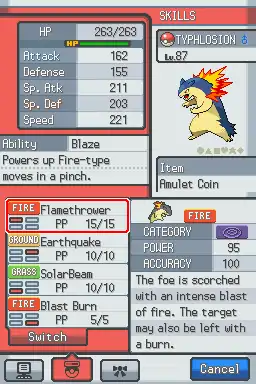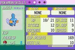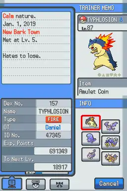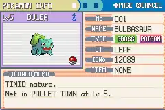| Nickname, species, type, OT, OT ID, level, experience, experience required to level up, HP (current and maximum), stats, status condition, list of moves and their PP |