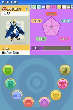 In Pokémon Ruby, Sapphire, and Emerald, the condition and sheen of a Pokémon are shown in the PokéNav, not in the summary. In some of the later games, they are shown in the summary.