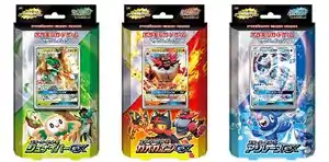 Featuring the three Alola region starter Pokémon, the Sun & Moon Starter Set Decks are a trio of Theme Decks each released separately in Japan. Released on December 9, 2016, the Decidueye-GX Starter Set Grass (Japanese: スターターセット草 ジュナイパーGX), Incineroar-GX Starter Set Fire (Japanese: スターターセット炎 ガオガエンGX), and Primarina-GX Starter Set Water (Japanese: スターターセット水 アシレーヌGX) each include a rulebook, damage counters, status counters, a custom coin, playmat.