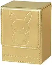 Deck case: Each gold chic leather-style Billiken Pikachu Flip Deck Case (Japanese: フリップデッキケース ビリケンさんピカチュウ) features a relief of the Billiken Pikachu statue. It comes with 2 card dividers bearing the same design and is secured shut with magnets.