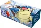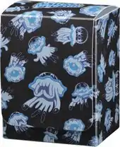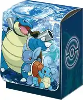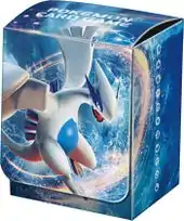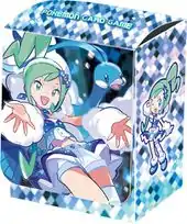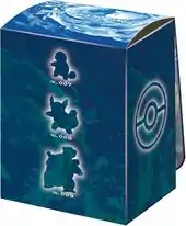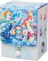 Deck case: The polyurethane Oceanic Operetta Flip Deck Case (Japanese: フリップデッキケース Oceanic Operetta) is stitched with a fabric interior lining and features an embroidered Pokémon Center logo and copyright information on the underside of the lid. The lid is secured by magnets and can be lifted using the plastic pearlescent charm on the front. Each case can hold 180 cards and come with 2 card dividers.