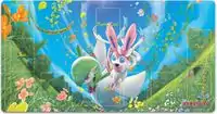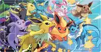 Playmat: The Dash! Eeveelutions Rubber Playmat (Japanese: ラバープレイマット ダッシュ!イーブイズ Rubber Playmat: Dash! EVs) features a full view of Eevee leaping forth alongside each of its evolved forms. Its evolutions leave trails of elemental energy behind them and stars resembling the move Swift envelop the ensemble.