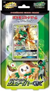Complementing the Collection Sun and Collection Moon expansions from December 9, 2016 were a set of three Sun & Moon Starter Sets, fulfilling a role similar to that of Theme Decks outside Japan. The first of these was the Decidueye-GX Starter Set Grass (Japanese: スターターセット草 ジュナイパーGX), which focuses on the final evolution of the Grass-type starter Pokémon Decidueye as one of the new Pokémon-GX. It also includes a rulebook, a player's guide, a GX marker, damage and status counters, a coin, and a playmat.