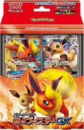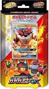 Focusing on the final evolution of the Fire-type starter Pokémon, Incineroar as a Pokémon-GX, the second of three Sun & Moon Starter Sets released on December 9, 2016 was the Incineroar-GX Starter Set Fire (Japanese: スターターセット炎 ガオガエンGX). The set also comes with a rulebook, a player's guide, a GX marker, damage and status counters, a coin, and a playmat.
