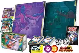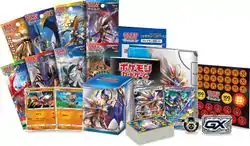 To mark the end of the Sun & Moon Era, a special product could be ordered from Pokémon Centers and the Pokémon Center Online starting August 16, 2019 as part of a make to order run. Each Limited Collection Master Battle Set (Japanese: リミテッドコレクション マスターバトルセット) includes 2 exclusive Full Art promotional cards, 64 card sleeves, a leather-like deck case, a playmat and accompanying playmat case, a set of 12 dice, a coin, 2 acrylic status counters, an acrylic GX marker, a leather-like damage counter case, and a ballpoint pen. Most of the TCG accessories have a plain black design with a rainbow Holofoil inset featuring the words "Pokémon Card Game" and the 11 Energy symbols. The set was limited to 5 per person and cost ¥13,200 including tax each. Sets began shipping to customers in early December 2019.