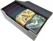 Card boxes: Each long card box can hold up to 750 cards or 400 cards in sleeves once assembled.
