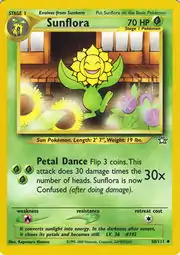 Sunflora (Japanese: キマワリ Kimawari) is a Grass-type Stage 1 Pokémon card. It is part of the Neo Genesis expansion.