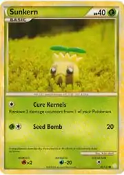 Sunkern (Japanese: ヒマナッツ Himanuts) is a Grass-type Basic Pokémon card. It is part of the HeartGold & SoulSilver expansion.