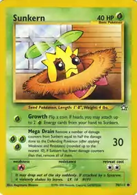 Sunkern (Japanese: ヒマナッツ Himanuts) is a Grass-type Basic Pokémon card. It was first released as part of the Neo Genesis expansion.