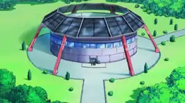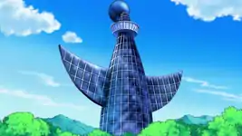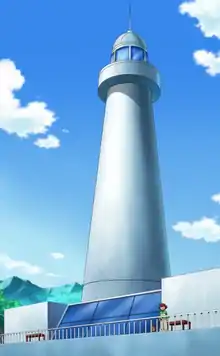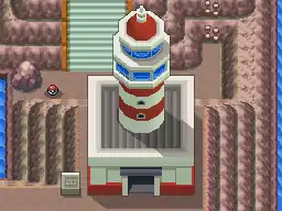 The Vista Lighthouse can be found in the far southeastern corner of Sunyshore City. While not as spectacular as the lighthouse in Johto, consisting only of an elevator and an observation deck, it has a similarity in that it is the location in which the city's Gym Leader, Volkner, is found before appearing in the Pokémon Gym. The player can see the Sinnoh Pokémon League building if they look into the binoculars. Volkner, unlike Jasmine, however, is not caring for an ailing Pokémon, merely contemplating remaining a Gym Leader or going to the Pokémon League to challenge the Elite Four, since he has had no worthy challengers for a while.