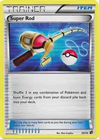 The Super Rod was introduced as a Trainer card in the Pokémon Trading Card Game during the English Neo Series (the Japanese Neo Era). It was first released in the Gold, Silver, to a New World... before debuting in English in the Neo Genesis expansion, with an illustration by Keiji Kinebuchi. Super Rod lets a player flip a coin. If heads, the player can put an Evolution card from their discard pile into their hand. If tails, the player can put a Basic Pokémon instead into their hand. It was later reclassified as an Item card during the Black & White Series (the Japanese BW Era). It was included in the Red Collection and then released in the English Noble Victories expansion with new artwork by 5ban Graphics. It was further reprinted in the Dragon Vault (artwork by 5ban Graphics) and BREAKthrough (artwork by Toyste Beach expansions, first released in the Japanese Dragon Selection subset and Noivern BREAK Evolution Pack respectively. It allows a player to shuffle 3 Pokémon or basic Energy cards from their discard pile into their hand.