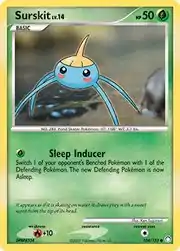 Surskit (Japanese: アメタマ Ametama) is a Grass-type Basic Pokémon card. It is part of the Mysterious Treasures expansion.