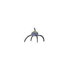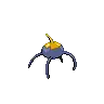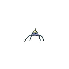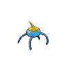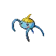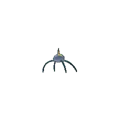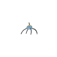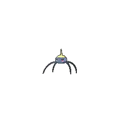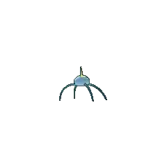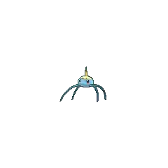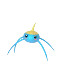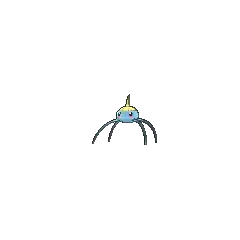 Surskit is a blue insectoid Pokémon. There are semicircular pink markings under its dark, circular eyes. It has a round body with four long, skinny legs extending from it. On top of its head is a yellow cap with a single antenna that secretes a thick, sugary syrup or a sweet scent. The syrup is exuded as a defense mechanism, while the scent can attract prey. This Pokémon can also secrete oil from the tips of its feet, which enables it to walk on water as though skating. Surskit inhabits ponds, rivers, and similar wetlands, where it feeds on microscopic, aquatic organisms. However, it sometimes appears in puddles after a rainstorm. In its natural habitat, Surskit has been known to compete with Dewpider over food.