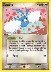 Swablu (Japanese: チルット Tyltto) is a Colorless-type Basic Pokémon card. It is part of the EX Deoxys expansion.
