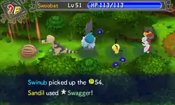 In Red Rescue Team and Blue Rescue Team, and Explorers of Time, Darkness and Sky, Swagger is a move with 18 PP and 100% accuracy. It targets enemy in the front, causing it to be confused and increasing its Attack stat by two stages. This move is affected by Magic Coat and Taunt.