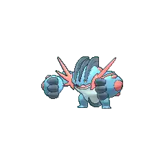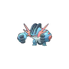 Swampert boasts the physical strength to easily drag a boulder weighing more than a ton, batter down opponents, and swim faster than a jet ski. It has keen eyesight, enabling it to see in murky waters. Swampert also has the ability to predict storms, sensing subtle differences in the sounds of waves and tidal winds with its fins. When a storm is approaching, Swampert will pile up boulders to protect its nest. It makes its nests on beautiful beaches. The reason Swampert covers itself in mud is that it wants to keep its skin moist.