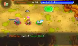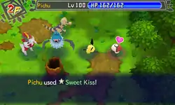 In Red Rescue Team and Blue Rescue Team and Explorers of Time, Darkness and Explorers of Sky, Sweet Kiss is a move with 15PP and 100% accuracy. The user targets enemy in the front, inflicting confusion on them if possible. This move is affected by Magic Coat, Taunt and Muzzled status condition.
