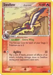 Swellow δ (Japanese: オオスバメ δ Ohsubame δ) is a Fire-type Stage 1 Pokémon card. It is part of the EX Dragon Frontiers expansion.
